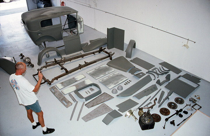 The Banker Bros. originally rodded this 3-window long before it was rebuilt and flamed by Boyd Coddington for current owner Gary Lorenzini who eventually de-Boyded it and had MicksPaint.com put it into primer.
